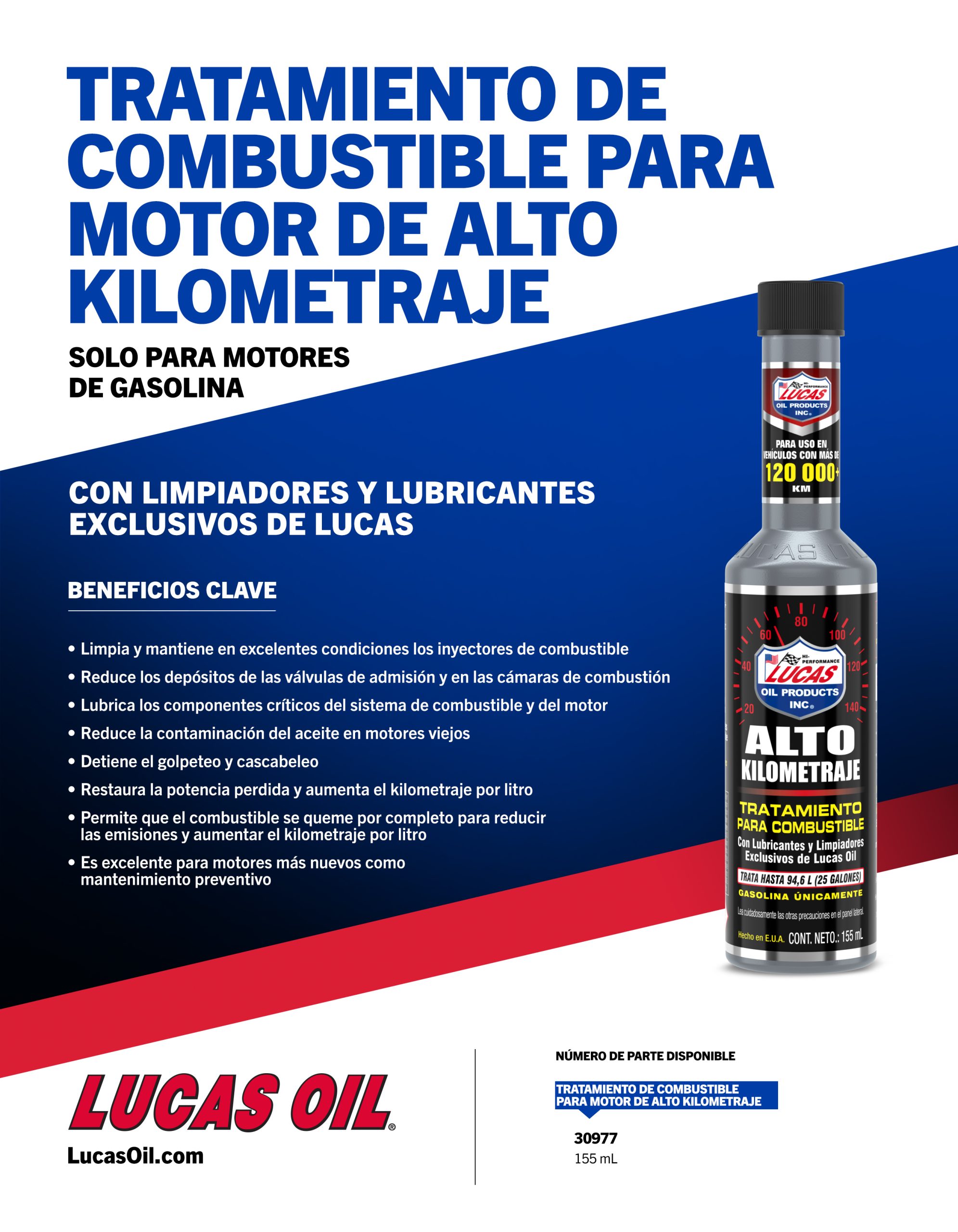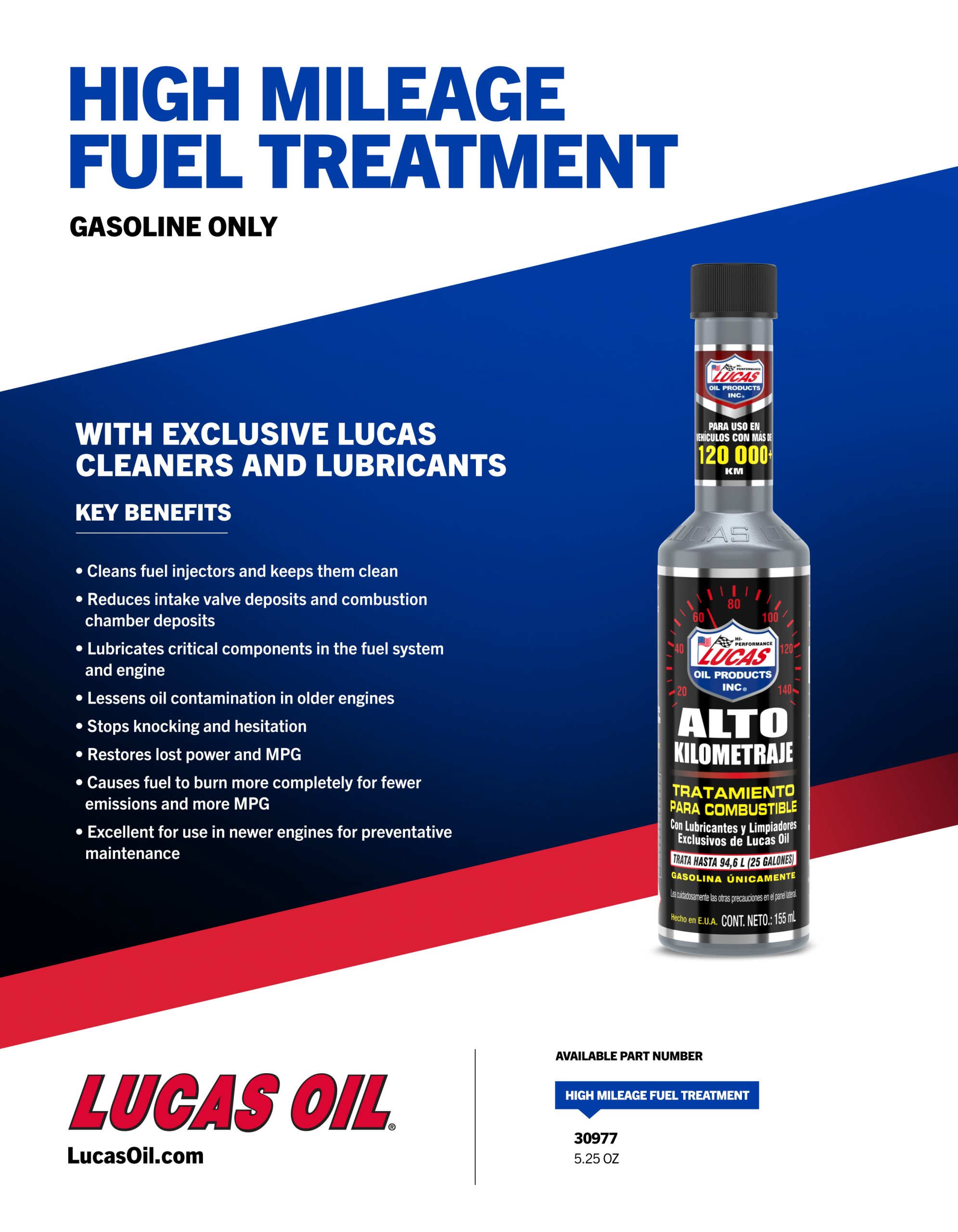 Lucas High Mileage Fuel Treatment is created specifically to restore lost power and performance in high-mileage vehicles. It cleans and lubricates fuel system components, removes valve deposits, lessens oil contamination and stops knocking and hesitation. Additionally, Lucas High Mileage Fuel Treatment works great in modern port-injected engines – maintaining maximum flow and providing lubrication to critical parts. CONTAINS NO ALCOHOL. OXYGEN-SENSOR SAFE.