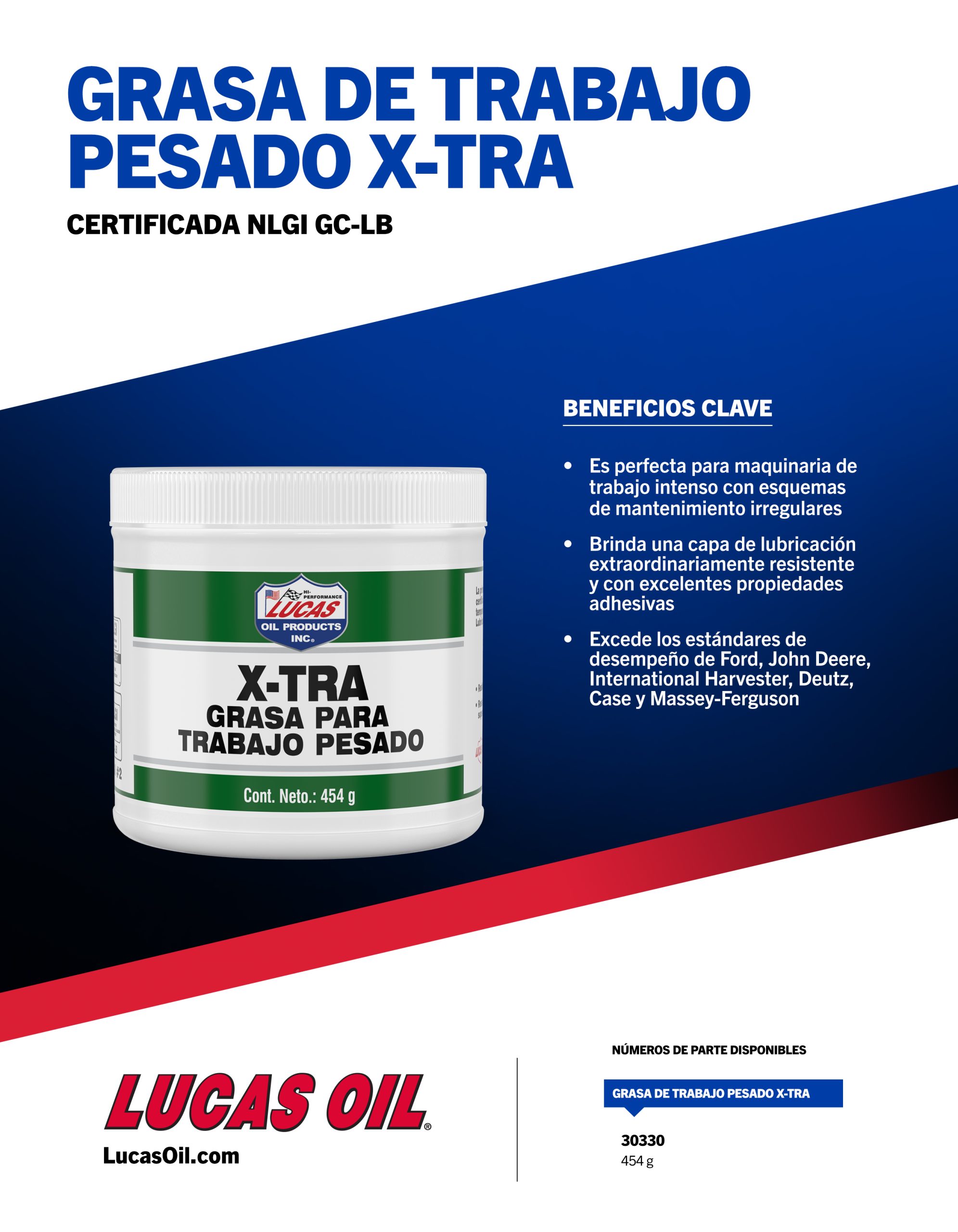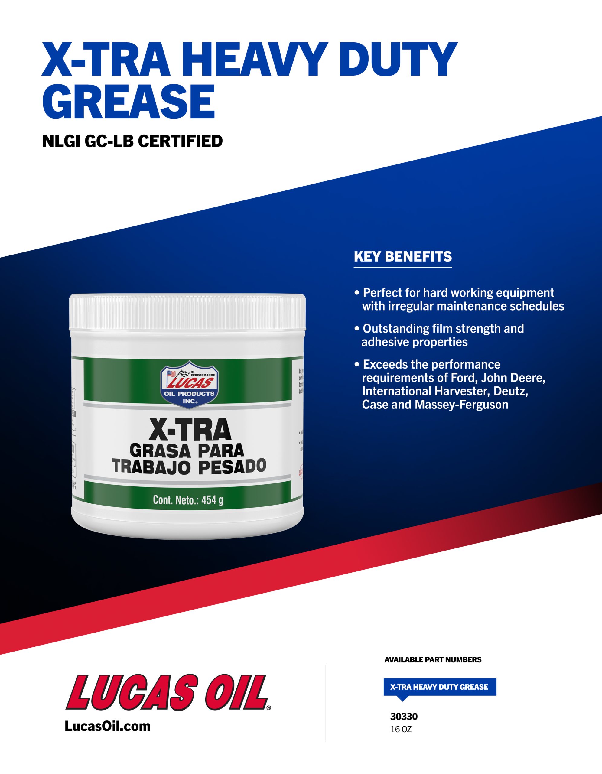 Lucas X-TRA Heavy Duty Grease was formulated for automotive, agricultural, heavy-duty and industrial applications. It is virtually waterproof and is more stable than all conventional lithium grease. It is fortified with an extreme pressure additive package and it exceeds OEM Lube for Life specifications.